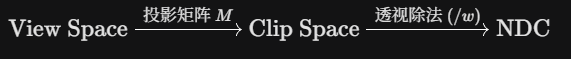 经过投影(Projection)后,应用projection矩阵变为裁剪空间(Clip Space)。这一步将视锥进行线性变换,裁剪视锥外的区域,存储压缩信息,便于后续变换到NDC。