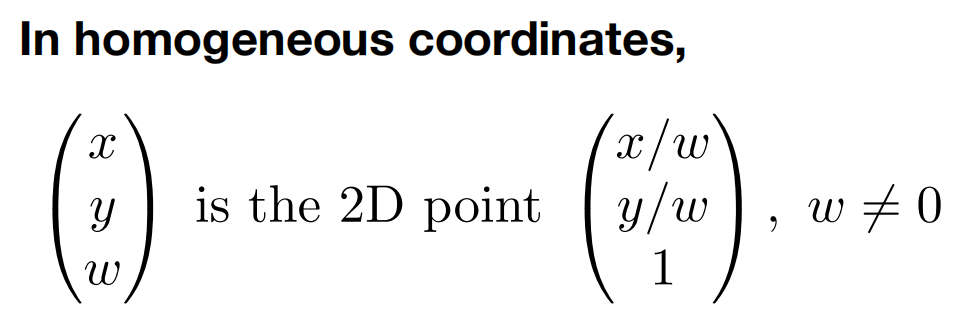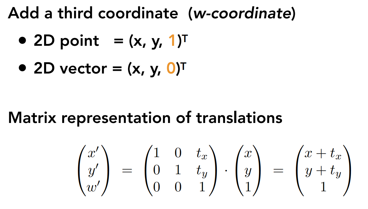 齐次坐标系中多引入了一个维度 \omega ,当它为0时表示向量,为1时表示点。于是二维平移变换就可以用上面的三维矩阵表示。